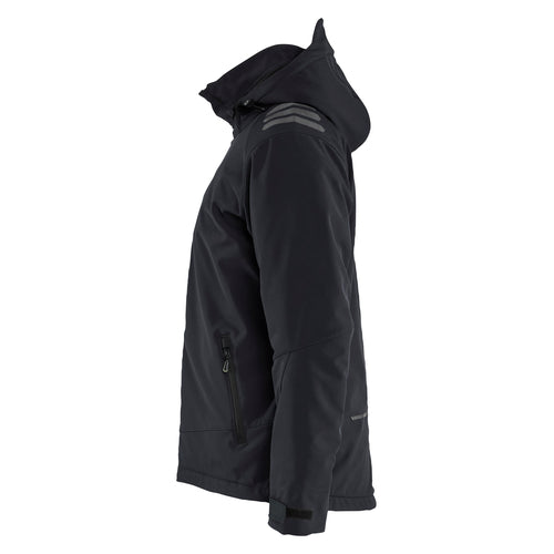 Constructed from a breathable 3-layer softshell fabric, the jacket features a detachable and adjustable hood, a high collar, and a fleece-lined zip flap for added comfort. Reflective details on the shoulders and back improve visibility in low-light conditions, while the extended back provides extra coverage.
